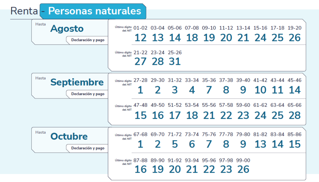 Es importante tener en cuenta que en otros vencimientos de importancia a nivel nacional se encuentran los relacionados con el envío de la información exógena nacional a la DIAN, para ello se debe tener en cuenta que los plazos máximos para dicho envío terminan en el periodo de 14 de mayo al 12 de junio de 2026 para Grandes Contribuyentes y en el periodo de 28 de abril a 13 de mayo de 2025 para personas naturales y juridicas. Para mayor detalle en el siguiente link de la DIAN se podrá observar la fecha exacta para cada contribuyente: